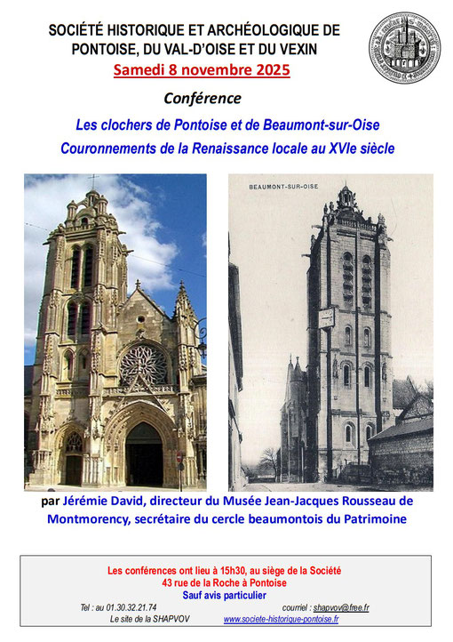 Les conférences ont lieu à 15 H 30, au siège de la Société, 43 rue de la Roche à Pontoise,